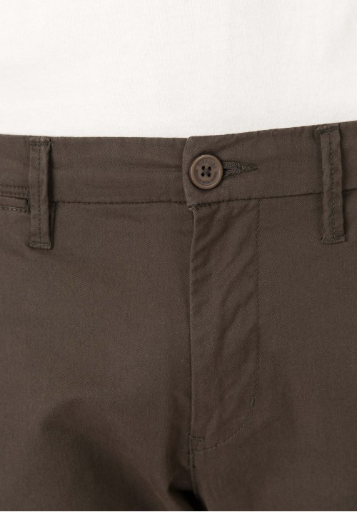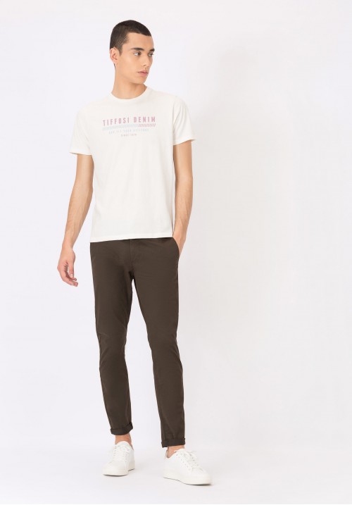 Pantalón slim fit con cinco bolsillos. Cierre frontal con cremallera y botón.